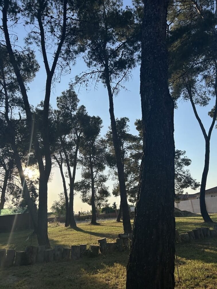 Jardín con pinos y zonas de sombra.